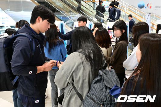 [OSEN=김포공항, 조은정 기자]류지현 감독이 이끄는 대한민국 야구 대표팀이 12일 김포국제공항을 통해 일본 도쿄로 출국했다. 대표팀은 오는 15~16일 양일에 걸쳐 도쿄돔에서 일본 대표팀과 평가전 2경기를 치른다. 이호성이 팬들에게 사인을 해주고 있다. 2025.11.12 /cej@osen.co.kr