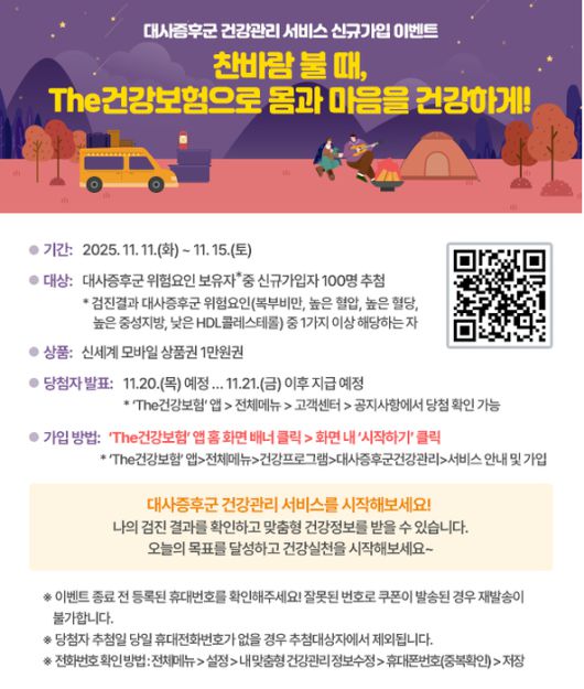 이벤트는 국가건강검진 결과에서 대사증후군 위험요인 중 한 가지 이상 해당되는 이용자가 모바일 앱에서 해당 서비스에 신규 가입하면 참여할 수 있다.