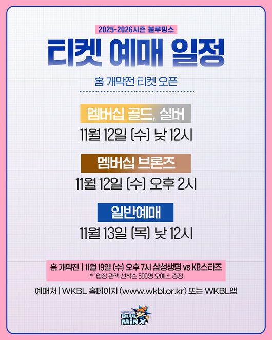 용인삼성생명블루밍스농구단이 11월 19일(수) 용인실내체육관에서 열리는 2025~2026시즌 정규리그 홈 개막전 입장권 예매를 11월 13일(목) 낮 12시부터 시작한다. 경기 예매는 WKBL 앱과 WKBL 홈페이지(www.wkbl.or.kr)를 통해 가능하다. 블루밍스 홈경기 입장권은 매 경기 6일 전 낮 12시부터 예매가 오픈된다.