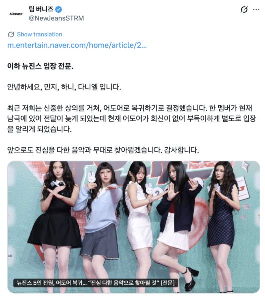 민지, 하니, 다니엘은 12일 "최근 저희는 신중한 상의를 거쳐, 어도어로 복귀하기로 결정했다"며 "한 멤버가 현재 남극에 있어 전달이 늦게 됐다"고 밝혔다.
