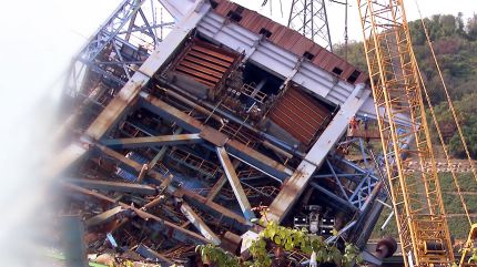 리프트에 오른 해체 전문가들이 무너진 5호기 타워 상단부를 세밀히 살펴봅니다.