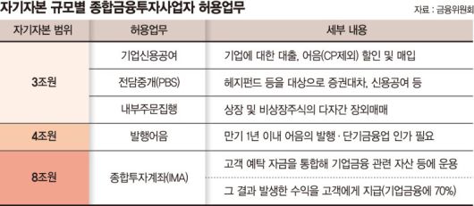 대신 종투사는 발행어음과 IMA 조달액의 25%를 의무적으로 국내 모험자본에 공급해야 한다. 모험자본은 중소·벤처기업, 벤처캐피털(VC), 신기술사업조합, 코스닥벤처펀드, 하이일드펀드 등에 대한 투자를 의미한다. 내년에 10%에서 시작해 2027년 20%, 2028년 25%로 확대된다.