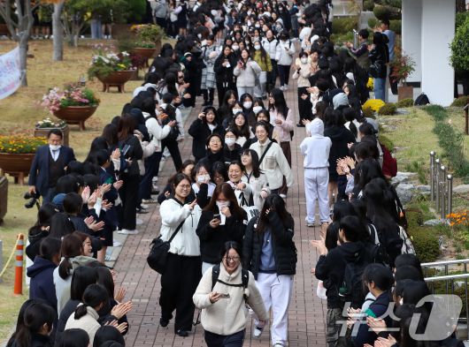 2026학년도 대학수학능력시험 예비소집일인 12일 부산 사상구 주례여자고등학교에서 고3 수험생들이 고2 후배들의 응원을 받으며 교정을 나서고 있다. 2025.11.12/뉴스1 ⓒ News1 윤일지 기자 |