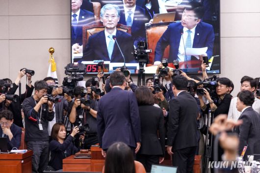 국민의힘 소속 법제사법위원들이 지난달 13일 서울 여의도 국회에서 열린 법제사법위원회의 대법원 등에 대한 국정감사에서 조희대 대법원장의 이석과 의사진행 방식 등을 두고 항의하고 있다. 유희태 기자 |