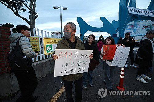 (제주=연합뉴스) 박지호 기자 = 2026학년도 대학수학능력시험일인 13일 오전 제주시 노형동 제주제일고에 마련된 제주도교육청 95지구 제2시험장 입구에서 선생님들이 수험생을 응원하고 있다. 2025.11.13
