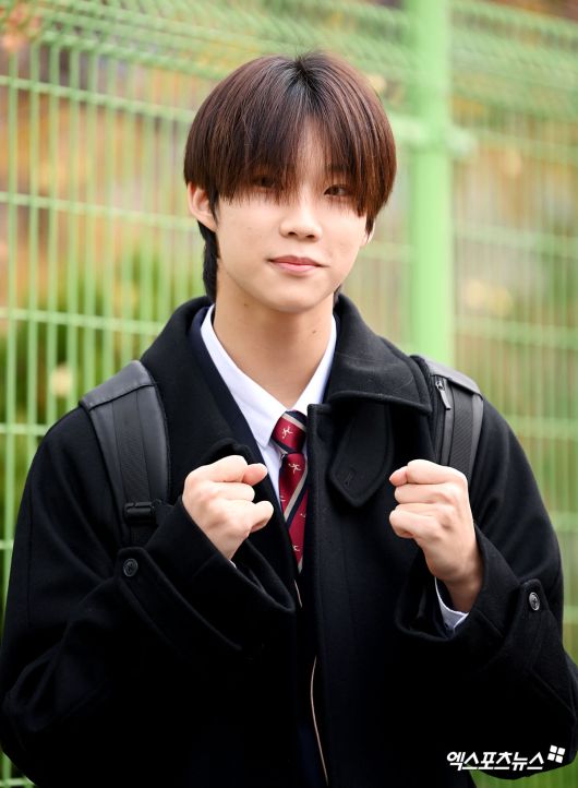 그룹 더윈드 박하유찬이 수능을 치르기 위해 수험장으로 들어가기 전 취재진을 향해 포즈를 취하고 있다.