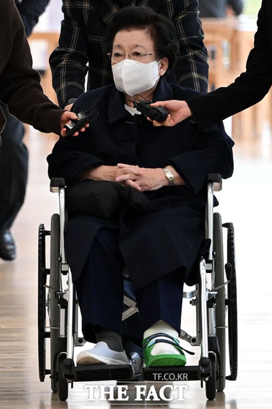 [더팩트ㅣ남용희 기자] 이배용 전 국가교육위원장이 13일 오전 서울 종로구 광화문 KT 빌딩에 마련된 김건희 특검 사무실로 휠체어를 탄 채 출석하고 있다.
