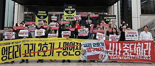 (서울=연합뉴스) 류효림 기자 = 환경운동연합을 비롯한 시민단체 회원들이 13일 서울 중구 원자력안전위원회 앞에서 기자회견을 열고 고리 2호기 수명연장 심사 중단을 촉구하고 있다. 2025.11.13