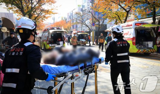 (서울=뉴스1) 이호윤 기자 = 13일 경기 부천 오정구 원종동 제일시장에서 A 씨가 몰던 1톤 트럭이 돌진하는 사고가 발생해 소방 관계자들이 피해입은 시민들을 구조하고 있다. 2025.11.13/뉴스1256@news1.krCopyright ⓒ 뉴스1. All rights reserved. 무단 전재 및 재배포, AI학습 이용 금지.