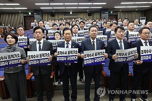 (서울=연합뉴스) 박동주 기자 = 더불어민주당 정청래 대표와 김병기 원내대표가 13일 서울 여의도 국회에서 열린 의원총회에서 "정치검사 규탄한다!"라고 적힌 팻말을 들고 구호를 외치고 있다. 2025.11.13