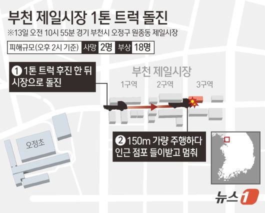 (서울=뉴스1) 김초희 디자이너 = 13일 부천 소방서와 경찰 등에 따르면 오전 10시 55분쯤 경기 부천시 오정구 원종동 제일시장에서 1톤 트럭이 상가로 돌진했다. 이 사고로 20명이 중경상을 입어 인근 병원으로 옮겨졌고, 이중 심정지 상태였던 2명은 사망한 것으로 알려졌다. 사고를 낸 차량은 후진을 한 뒤 전통시장 내 150m가량을 주행하다가 인근 점포를 들이받고 멈춰 선 것으로 나타났다. 경찰은 운전자 60대 A 씨를 교통사고처리 특례법상 과실, 치사상 혐의로 긴급체포했다.