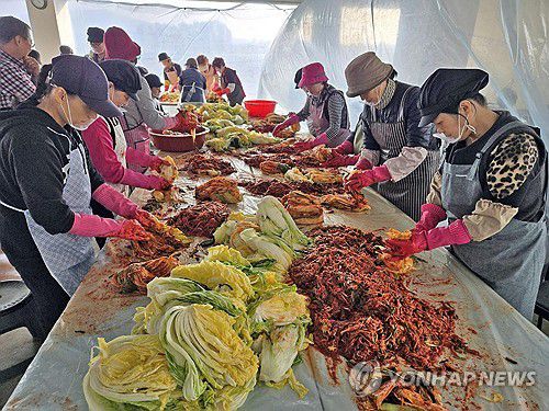 (춘천=연합뉴스) 이상학 기자 = 13일 춘천성도교회에서 교인과 효자1동 행정복지센터 직원, 통장협의회 회원 등 50여명이 참가해 불우이웃을 돕는 600포기 김장나누기 행사를 하고 있다. 2025.11.13