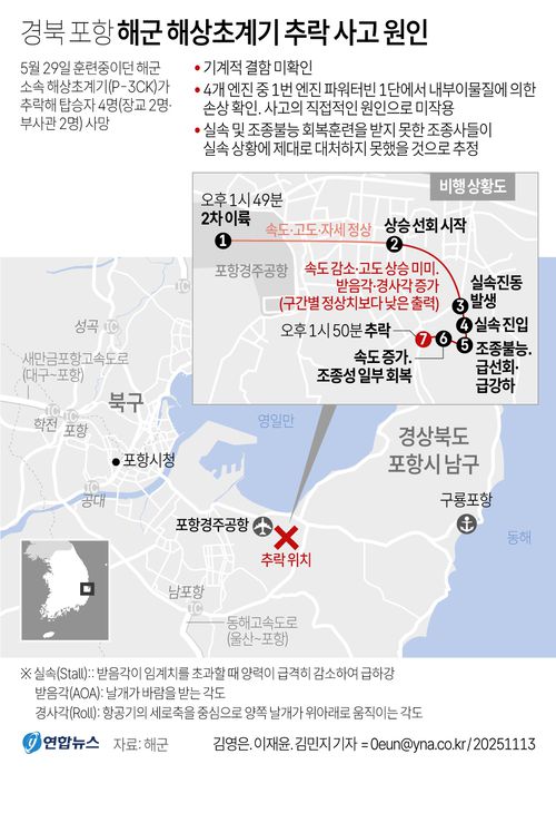 해군이 지난 5월 29일 조종사·승무원 4명이 순직한 포항 P-3CK 해상초계기 추락사고의 직접적인 이유를 확인하지 못했다고 13일 밝혔다.