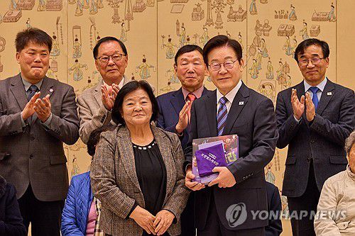 (서울=연합뉴스) 이재명 대통령이 13일 용산 대통령실에서 열린 민주화실천가족운동협의회 초청 오찬 간담회에서 조순덕 민가협 상임의장으로부터 민가협 40주년 기념 사진첩을 받고 있다. 2025.11.13 [대통령실 제공. 재판매 및 DB 금지]
