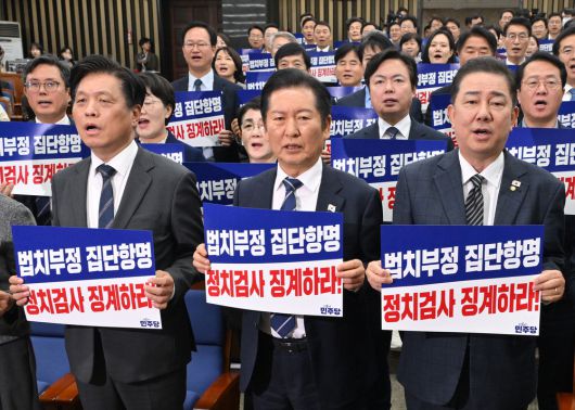 13일 더불어민주당 의원총회에 참석한 의원들이 '정치검사 징계하라' 팻말을 들고 구호를 외치고 있다. 앞줄 왼쪽부터 조승래 사무총장, 정청래 대표, 김병기 원내대표. 김재훈 기자 |
