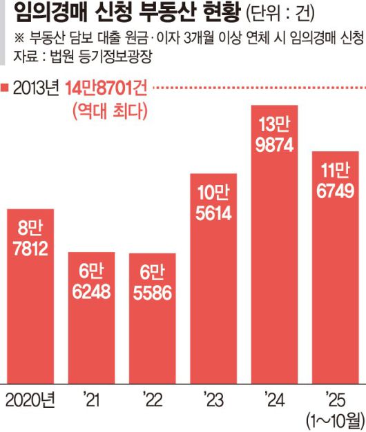 12일 법원 등기정보광장에 따르면 올해 1~10월 전국에서 임의경매개시결정등기를 신청한 부동산은 11만6749건으로 나타났다. 임의경매는 금융기관 등에 부동산을 담보로 돈을 빌린 채무자가 원금이나 이자를 3개월 이상 연체하면 부동산을 경매에 넘기는 절차다. 올해 들어 월평균 1만1675건의 부동산이 임의경매로 넘어간 것으로, 이 같은 추세대로면 연말까지 총 14만건을 넘길 것으로 예측된다.