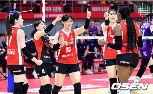 [OSEN=광주, 최규한 기자] 13일 오후 광주 페퍼스타디움에서 ‘진에어 2025~2026 프로배구 V리그’ 여자부 페퍼저축은행과 흥국생명의 경기가 열렸다. 이날 경기는 홈팀 페퍼저축은행이 세트스코어 3-1(25-22, 23-25, 28-26, 25-23)로 승리를 거뒀다. 4세트, 페퍼저축은행 선수들이 득점을 올린 뒤 기뻐하고 있다. 2025.11.13 / dreamer@osen.co.kr
