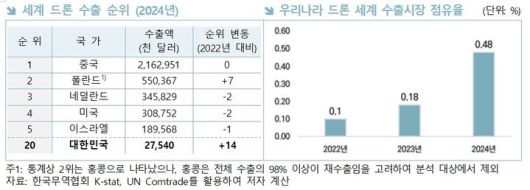 보고서는 한국 드론 산업이 낮은 부품 자립도와 기술 인력 부족, 연구개발 인프라 한계 등을 안고 있어 수출 경쟁력 확보에 어려움을 겪고 있다고 지적했다.