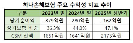 하나손보가 장기보험 영업을 적극적으로 펼치면서 수익성 지표인 CSM 잔액도 성장하는 모습이다. 지난 2023년 말 1651억원 규모였던 CSM은 2024년 말 1641억원으로 비슷한 수준이었다. 올해 상반기 말 기준 CSM은 2173억원으로 2000억원을 돌파했다.