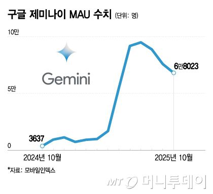 다만 구글 제미나이는 해외 시장에서 챗GPT의 아성을 위협하는 존재로 거듭나고 있다. 순다르 피차이 구글 CEO는 지난달 말 3분기 실적 발표에서 제미나이의 글로벌 MAU가 6억5000만명을 기록해 전분기(4억5000만명) 대비 2억명 증가했다면서 '나노 바나나' 출시에 힘입었다고 밝혔다. 이는 챗GPT(약 10억명 추정)에 이어 전 세계 두 번째다.