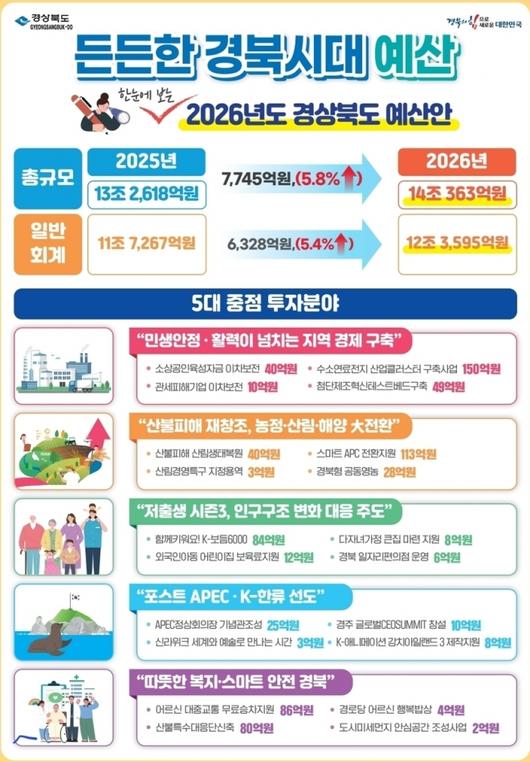 경북도는 14조 363억원 규모의 2026년도 세입·세출 예산안을 편성해 도의회에 제출했다고 14일 밝혔다.