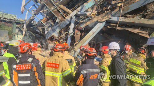 (울산=연합뉴스) 울산화력발전소 보일러 타워 붕괴 사고 9일째인 14일 오전 발전소 현장에서 중장비를 동원한 수색 작업이 밤낮없이 이어지고 있는 가운데 구조대원 등 구조팀 관계자들이 수색 계획에 대해 논의하고 있다. 지난 6일 발생한 이 사고로 현재까지 매몰자 7명 중 6명이 사망했고 1명이 잔해 속에 묻혀 실종된 상태다. 2025.11.14 [울산소방본부 제공.재판매 및 DB 금지]