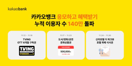 카카오뱅크는 이용자 확대를 기념해 특별 이벤트를 진행하고 있다. 12일부터 16일까지는 당첨자 100명을 뽑아 티빙 OTT 6개월 구독권을 선물로 제공한다. 17일부터 23일까지는 응모 선정 고객 10명에게 문화상품권 50만원권을 지급한다. 24일부터 11월 말까지는 진행되는 이벤트에는 신라호텔 더 파크뷰 2인 식사권을 20명의 고객에게 선물할 예정이다.