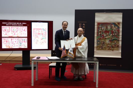 신흥사 지혜 주지스님과 맥스 홀라인 메트로폴리탄미술관 관장이 14일 서울 마포구 KGIT 센터에서 열린 속초 신흥사 시왕도 반환 언론 공개회에서 협약서를 들어 보이고 있다. 연합뉴스 |