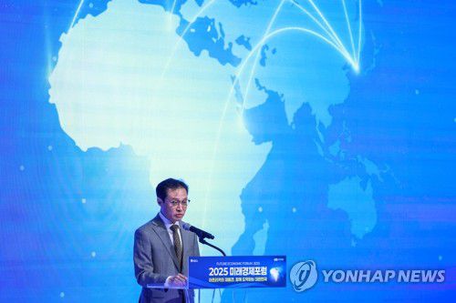 (서울=연합뉴스) 홍해인 기자 = 이규연 대통령실 홍보소통수석이 14일 서울 중구 롯데호텔에서 국가기간뉴스통신사 연합뉴스 주최로 열린 '2025 미래경제포럼'에서 이재명 대통령의 축사를 대독하고 있다. 2025.11.14