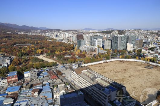 (서울=뉴스1) 박정호 기자 = 국가유산청이 올해 안으로 유네스코 세계유산 종묘 일대를 '세계유산지구'로 지정 고시와 관련 행정 절차를 마치고, 서울시에 세계유산영향평가를 요청할 계획이라고 밝혔다. 다만 서울시는 세운4구역이 종묘로부터 100m 이상 떨어져 있어 영향평가 대상이 될 수 없다는 입장을 고수하며 맞서고 있다. 사진은 이날 오후 서울 종로구 종묘와 세운 4구역 재개발 공사 현장 모습. 2025.11.14/뉴스1