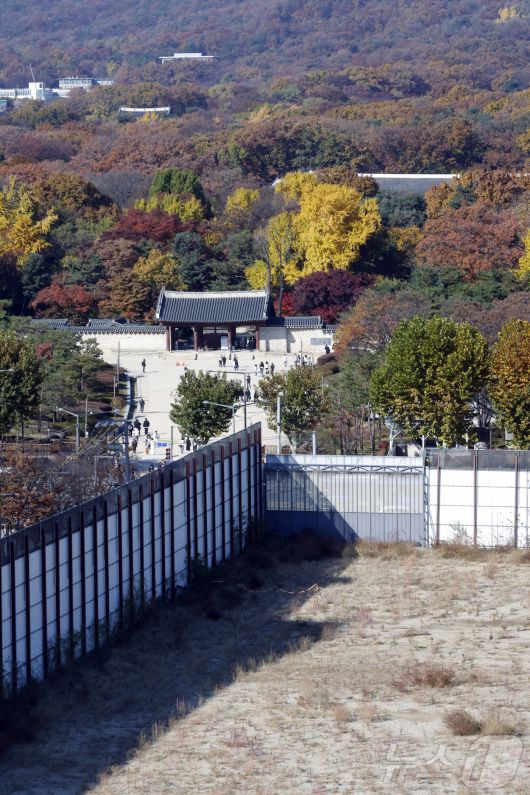 (서울=뉴스1) 박정호 기자 = 국가유산청이 올해 안으로 유네스코 세계유산 종묘 일대를 '세계유산지구'로 지정 고시와 관련 행정 절차를 마치고, 서울시에 세계유산영향평가를 요청할 계획이라고 밝혔다. 다만 서울시는 세운4구역이 종묘로부터 100m 이상 떨어져 있어 영향평가 대상이 될 수 없다는 입장을 고수하며 맞서고 있다. 사진은 이날 오후 서울 종로구 종묘와 세운 4구역 재개발 공사 현장 모습. 2025.11.14/뉴스1
