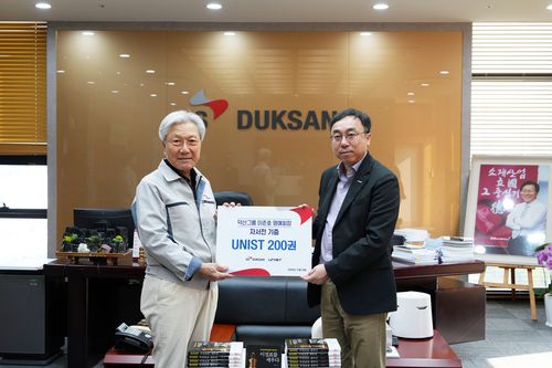(울산=연합뉴스) 장영은 기자 = 울산과학기술원(UNIST)은 대한민국 벤처 1세대인 이준호 덕산그룹 명예회장이 신간 저서 '이정표를 세우다' 200권을 기증했다고 14일 밝혔다.