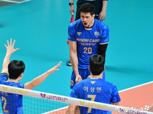 (엑스포츠뉴스 장충, 김한준 기자) 14일 오후 서울 장충체육관에서 열린 '진에어 2025-2026 V-리그' 우리카드와 한국전력의 경기, 우리카드 아라우조가 득점 후 기뻐하고 있다.김한준 기자 kowel@xportsnews.com