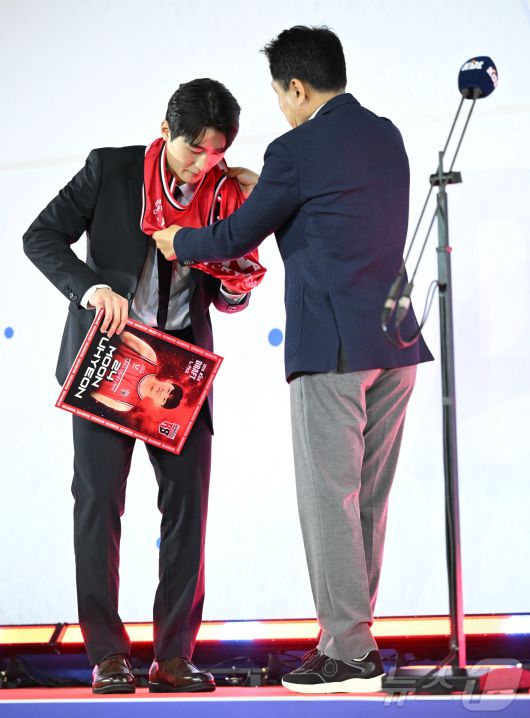 (서울=뉴스1) = 14일 오후 서울 송파구 잠실학생체육관에서 열린 2025 KBL 신인선수 드래프트에서 1라운드 1순위로 안양 정관장의 지명을 받은 문유현이 유도훈 감독의 도움으로 유니폼을 입고 있다. (KBL 제공. 재판매 및 DB 금지) 2025.11.14/뉴스1