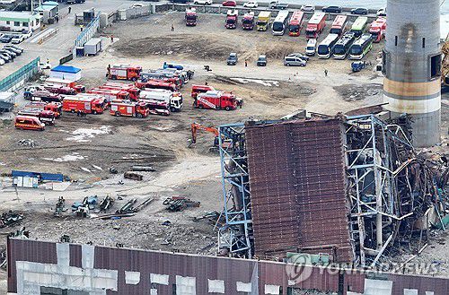 (울산=연합뉴스) 손형주 기자 = 울산화력발전소 붕괴 사고 일주일째인 12일 오전 울산화력발전소 앞에서 소방 장비들이 대기하고 있다. 이번 사고 매몰자 7명 중 사망자는 5명이며 나머지 2명은 여전히 매몰 상태다. handbrother@yna.co.kr |