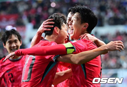 후반 한국 손흥민이 프리킥으로 선제골을 작렬시킨 뒤 동료들과 기뻐하고 있다. 2025.11.14 / dreamer@osen.co.kr
