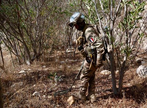 레바논 남부 '블루라인' 근처에서 폭발물 탐지 중인 UNIFIL 병력 |