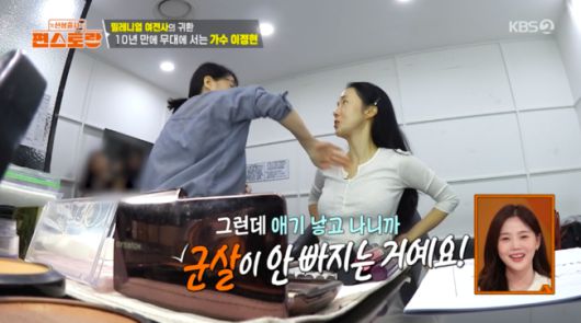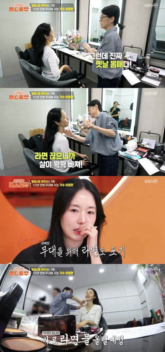 대망의 녹화 당일, 가수로 변신 중인 이정현은 메이크업 아티스트에 “10년 만에 보는 것 같다”라고 전했다. 이어 “옛날 몸매가 됐다”는 메이크업 아티스트 말에 “애 둘 낳고 나니까 군살이 안 빠지더라. 근데 라면 끊으니까 살이 쫙쫙 빠졌다”라고 다이어트 비결을 밝혔다.