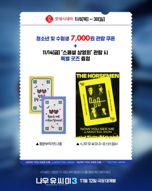 롯데시네마에서는 할리우드 블록버스터 ‘나우 유 씨 미 3’ 청소년 상영회가 마련됐다. 영화를관람한 청소년 관객들에게 행운부적카드 2종과 영화 포스터 엽서를 증정한다.