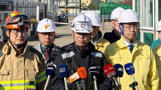 ▲ 울산화력발전 붕괴 사고 중앙사고수습본부 공동 본부장인 김영훈(가운데) 고용노동부 장관이 15일 오전 사고 현장 앞에서 브리핑하고 있다.