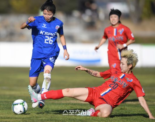 화천 KSPO 김유리가 15일 화천생활체육공원 주경기장에서 열린 2025 WK리그 챔피언결정전 서울시청과 2차전에서 상대 태클을 피하고 있다.2025.11.15.화천 | 최승섭기자 thunder@sportsseoul.com [기사제보 news@sportsseoul.com] Copyright ⓒ 스포츠서울&sportsseoul.com