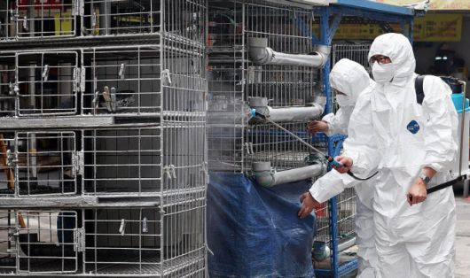 지난 5월 21일 광주 북구청 시장산업과 동물정책팀 직원들이 관내 한 재래시장 닭오리 판매업소에서 조류인플루엔자 예방을 위해 긴급 방역을 실시하고 있다.(사진=연합뉴스) |