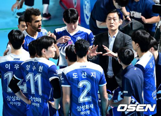 [OSEN=대전, 최규한 기자] 15일 오후 대전 충무체육관에서 ‘진에어 2025~2026 프로배구 V리그’ 남자부 삼성화재와 KB손해보험의 경기가 열렸다. 홈팀 삼성화재는 2승 5패 승점 7, 방문팀 KB손해보험은 4승 2패 승점 13을 마크하고 있다. 1세트, 삼성화재 김상우 감독이 선수들과 작전타임을 갖고 있다. 2025.11.14 / dreamer@osen.co.kr