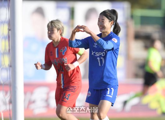 화천 KSPO 위재은이 15일 화천생활체육공원 주경기장에서 열린 2025 WK리그 챔피언결정전 서울시청과 2차전에서 골을 넣은 후 세리머니를 하고 있다.2025.11.15.화천 | 최승섭기자 thunder@sportsseoul.com [기사제보 news@sportsseoul.com] Copyright ⓒ 스포츠서울&sportsseoul.com