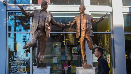 ▲ 트럼프와 엡스타인의 관계를 풍자하는 조형물 앞을 지나가는 미국 시민들