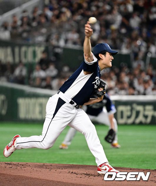[OSEN=도쿄(일본), 조은정 기자]15일 일본 도쿄돔에서 ‘2025 NAVER K-BASEBALL SERIES’ 대한민국과 일본의 1차전 경기가 열렸다. 한국은 곽빈, 일본은 소타니 류헤이를 선발투수로 내세웠다. 1회말 대한민국 곽빈이 역투하고 있다. 2025.11.15. /cej@osen.co.kr