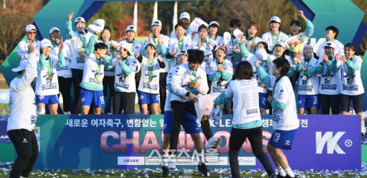 화천 KSPO 장유빈이 15일 화천생활체육공원 주경기장에서 열린 2025 WK리그 챔피언결정전 서울시청과 2차전 후 열린 시상식에서 강선미 감독과 댄스를 선보이고 있다.2025.11.15.화천 | 최승섭기자 thunder@sportsseoul.com [기사제보 news@sportsseoul.com] Copyright ⓒ 스포츠서울&sportsseoul.com