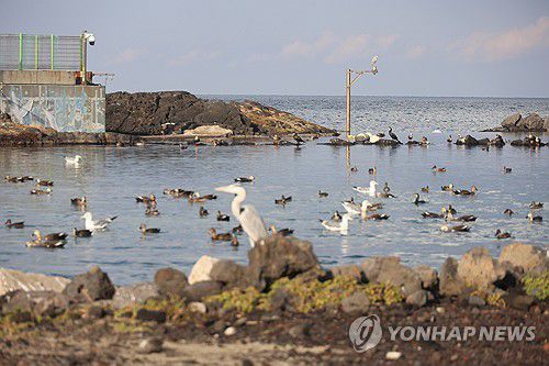 (제주=연합뉴스) 고성식 기자 = 16일 제주시 구좌읍 행원리 앞바다에서 왜가리와 갈매기, 청둥오리 등이 양식장 배출수와 바다가 만나는 지역에 모여 먹이를 찾고 있다. 제주에는 담수성 먹이자원이 부족하지만, 육상 양식장에서 나오는 배출수 지역이 있어 왜가리 등이 먹이를 획득하는데 용이한 것으로 학계에서 조사됐다. 2025.11.16