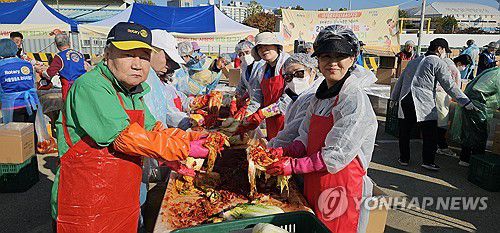 (서울=연합뉴스) 15일 서울 양천구 목동공영주차장에서 열린 2025 행복나눔 사랑의 김장 담그기에서 국제로타리 3640지구 봉사대원 및 다문화가정 400여명이 김장을 담그고 있다.
