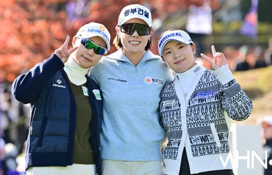 정윤지, 박주영, 이다연이 1번 홀 티샷을 한 후 포즈를 취하고 있다.
